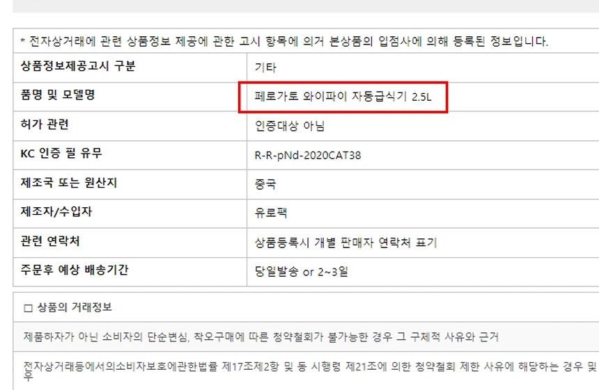 제가 등록하고자하는 반려견 급식기 도매사이트 상세페이지에 “상품정보제공고시”에 보이 이 제품의 품명 및 모델명이 “페로가토 와이파이 자동급식기 2.5L”이라고 나와 있습니다.