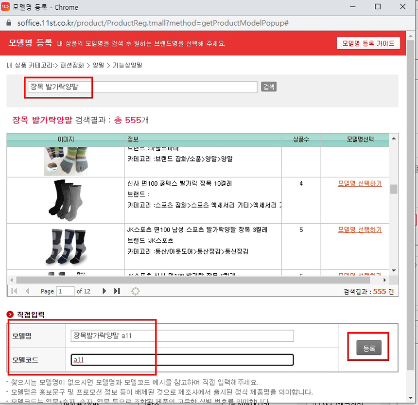 저는 “장목발가락양말 a11”이라고 만들었고, 아래 “모델코드”에 “a11”이라고 그냥 자신이 이름을 지으시면 됩니다.