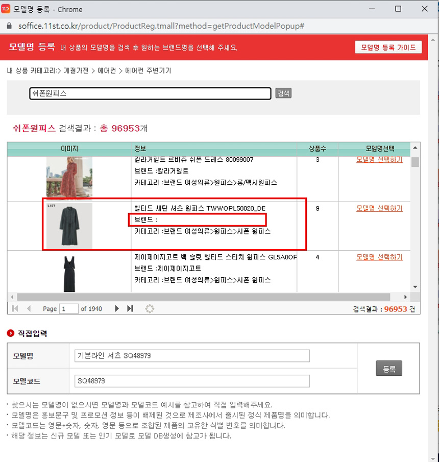 2. 내가 등록하고자하는 상품이 모델명은 매칭이 되어있는데, 브랜드명은 매칭이 되지 않은 상품.
