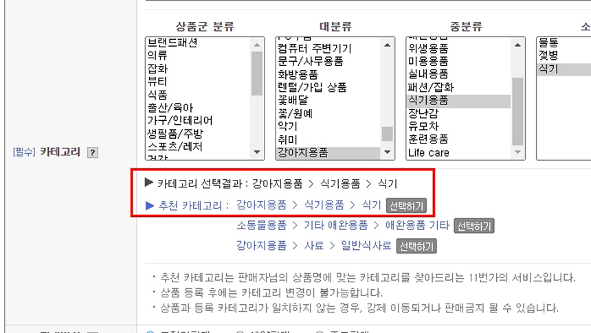 1. 아래 사진처럼 [상품군 분류]에 자신이 등록하고자하는 상품의 해당군을 선택하면 아래 [추천카테고리]가 몇 가지 나옵니다.