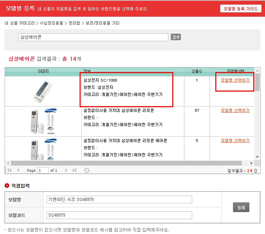 예시로 아래 사진은 “삼성에어콘”이러고 검색하니 내가 팔고자하는 삼성 리모컨의 “모델명”“브랜드”“카테고리”까지 전부 한 번에 매칭이 됩니다. 우측에 [모델명 선택하기]를 클릭하시면 됩니다.