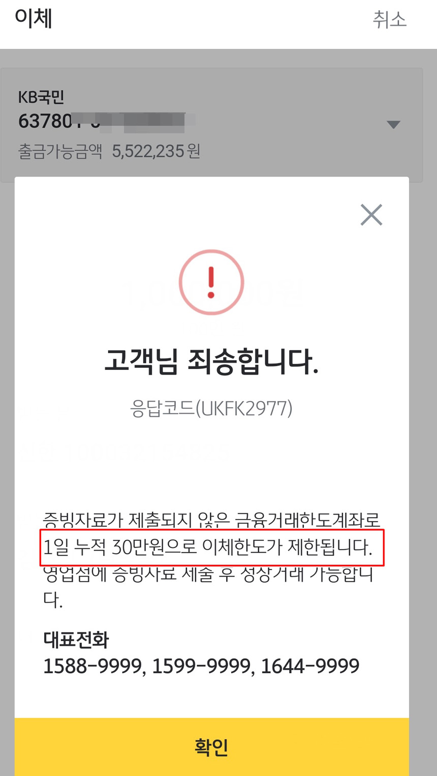 저는 사업자계좌가 국민은행인데 원래 통장자체 1일 이체한도는 1,000원인데,