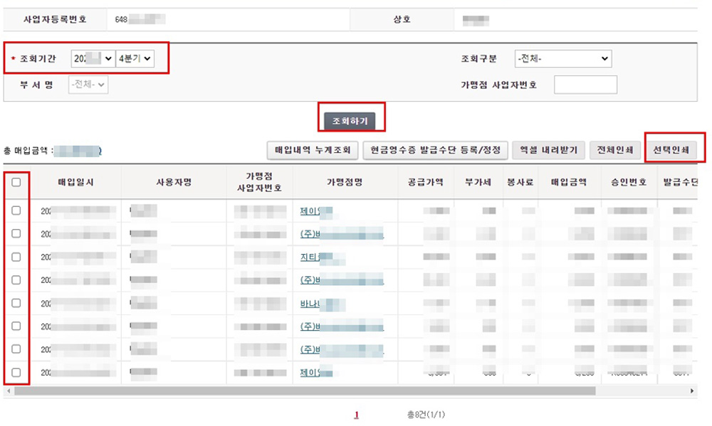 조회기간을 설정하고 [조회하기]클릭 후 일부 몇 건만 선택한 뒤 [선택인쇄]를 해서 은행에 가실 때 들고 가시면 됩니다.