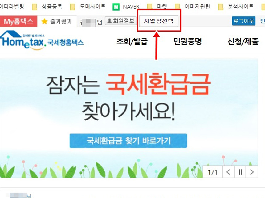국세청에 로그인을 한 뒤 [사업장 선택]을 클릭해 사업자로 로그인을 해 주세요