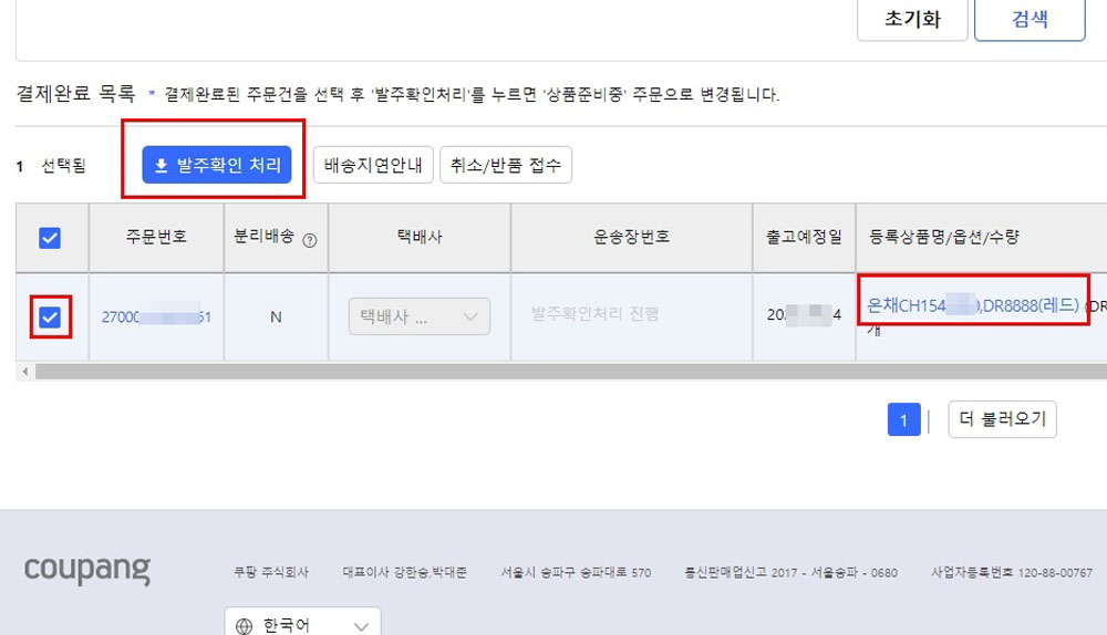 아래 화면에서 해당 주문건의 작은 사각형 박스에 체크를 하고 위의 [발주확인 처리]를 클릭해주세요.
