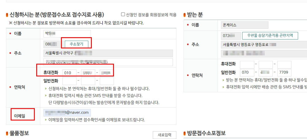[주소찾기]를 통해 고객주소를 입력하고 전화번호까지 입력을 해주었습니다.