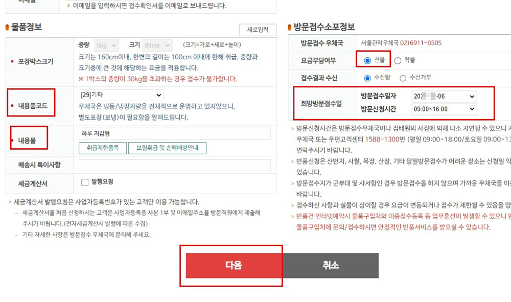 “요금부담여부”는 “선불(신용)”로 해주고(박스에 동봉도 선불이며 거의 선불로 합니다),