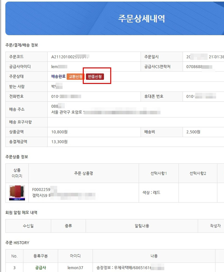 이제 도매사이트에 접속해 해당공급사에게 [반품신청]을 합니다.