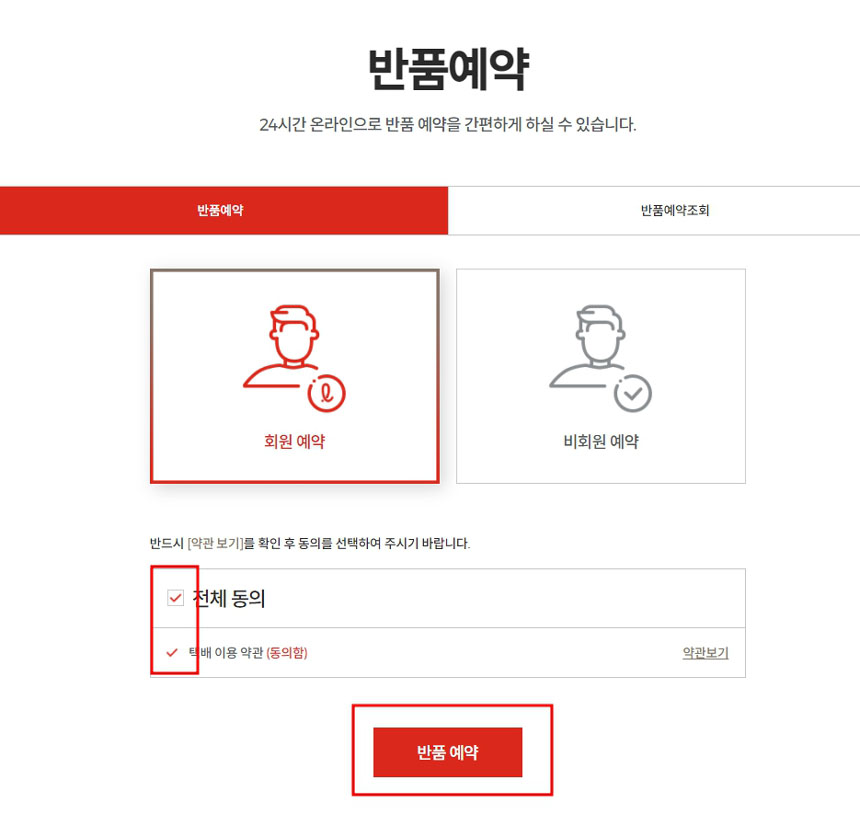 회원가입을 했으면 회원예약을 클릭 후 약관 동의하고 아래 [반품예약]을 클릭해주세요.
