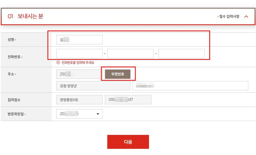 [보내시는 분]에 성명 란에 고객 이름을, 전화번호 란에 고객전화번호를 넣고