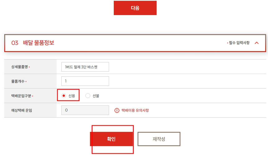 예상택배운임구분에 “신용”으로 체크하고 [확인]을 클릭해주세요.