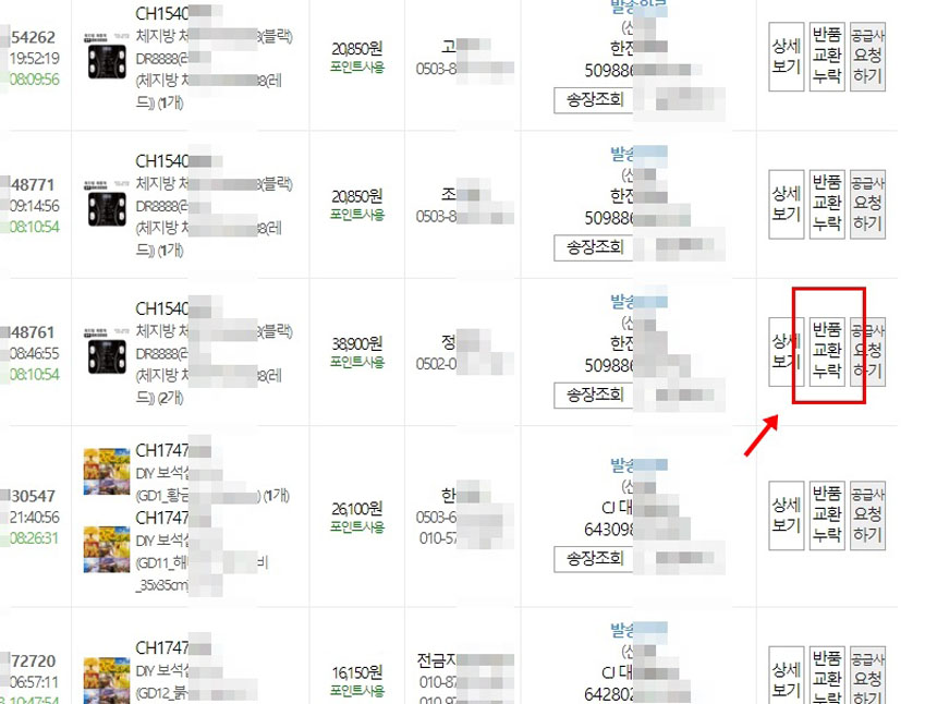 판매목록 중에서 해당상품과 고객명을 확인 후 우측의 [반품교환누락]버튼을 클릭해주세요.