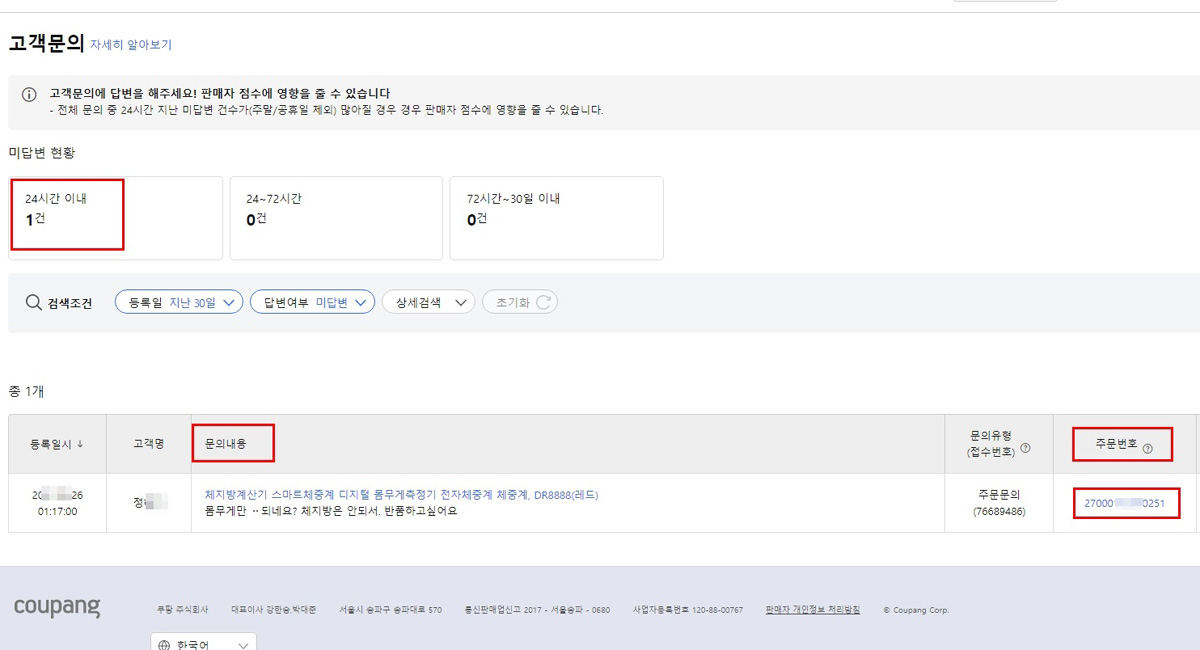이 부분을 쿠팡에서는 해결할 수 있는 것이 지난시간에 설명드린 [쿠팡확인요청]이란 버튼이 있습니다.
