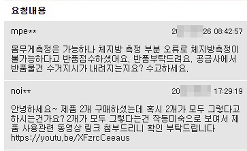 공급사는 “이 분이 체중계를 2개 구매했는데, 2개 모두가 불량인지”물어보셨어요.
