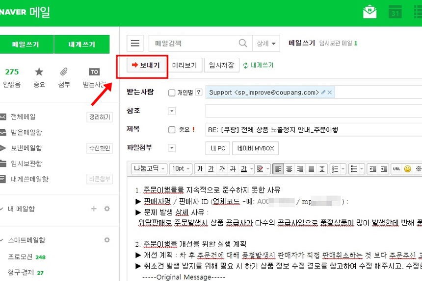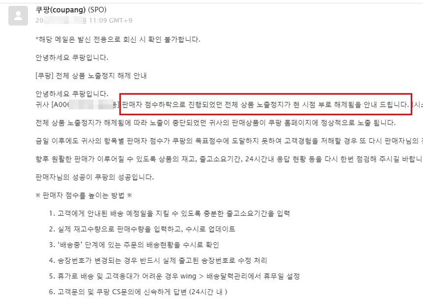 쿠팡으로부터 전체상품 노출이 안된다고 메일이 한 통왔어요.