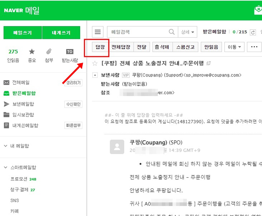자신이 쿠팡으로 받은 메일에서 [답장]을 클릭해주세요.
