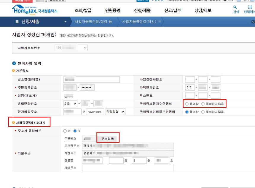 저와 같이 주소지 오류뿐만 아니라 각종 기존 사업자등록증상에 변경할 부분이 있다면 정정하시면 됩니다.