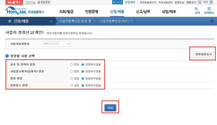 이러면 사업자등록증 정정 신청이 완료된 것입니다.