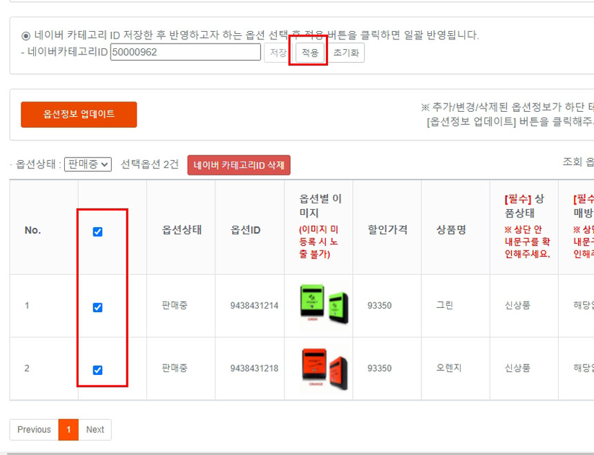 아래 상품의 체크박스에 체크 후 위의 [적용]을 클릭해주세요.