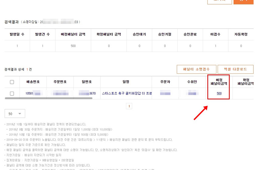 클릭해서 세부내용을 보면 아래 사진처럼 예정 페널티가 돈으로 500원이 발생합니다.