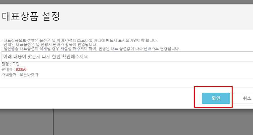 대표상품 확인창이 나타납니다.