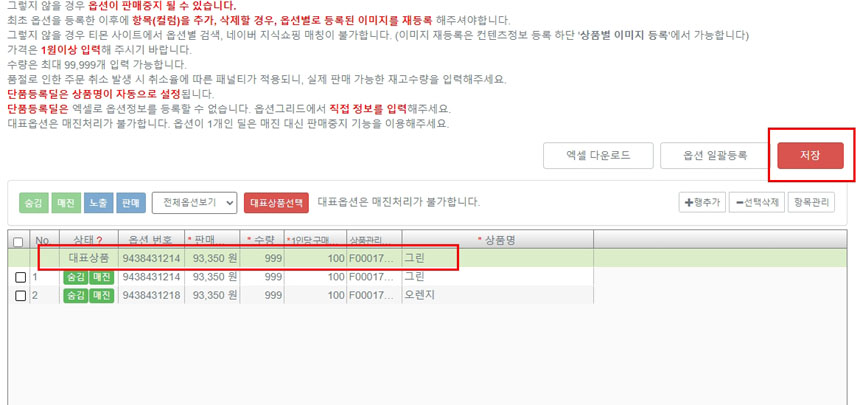 아래 판매가격, 수량, 1인당 구매가능수량, 상품명(옵션명)을 입력해주세요.