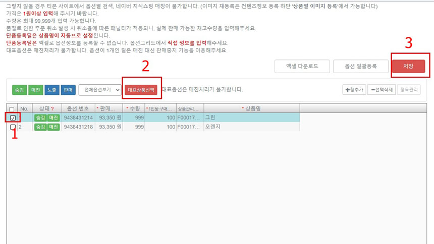 아래 옵션 중에 대표상품을 하나 체크하고 위의 [대표상품선택]을 클릭해주세요.