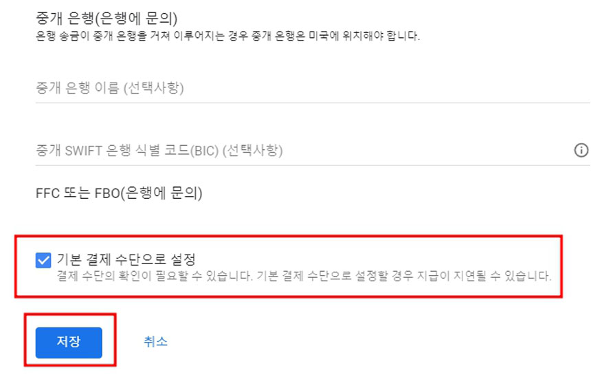 다시 원래외환계좌 창으로 돌아와서 아래 기본결재수단으로 설정에 체크하고 [저장]을 클릭해주세요.