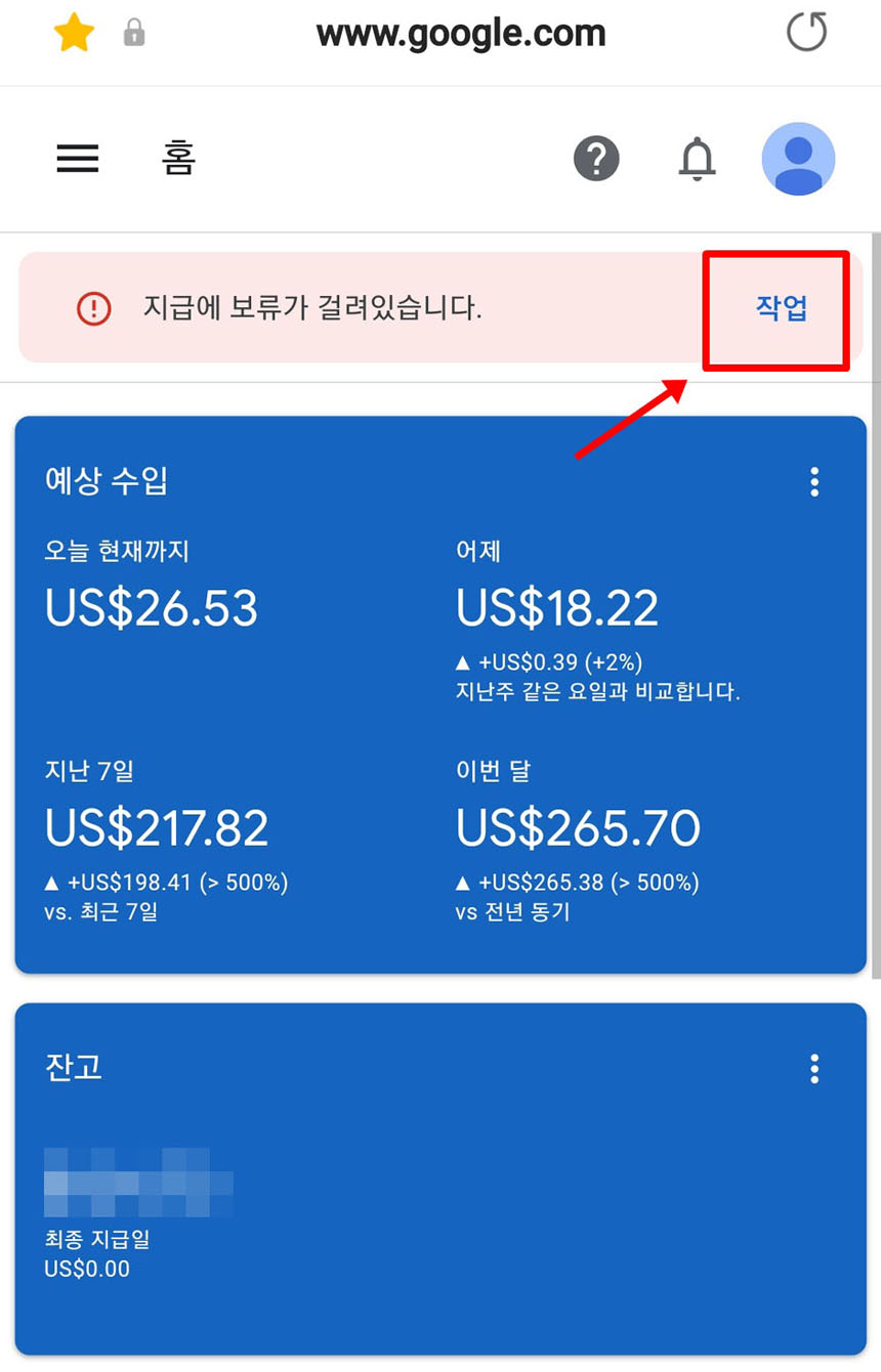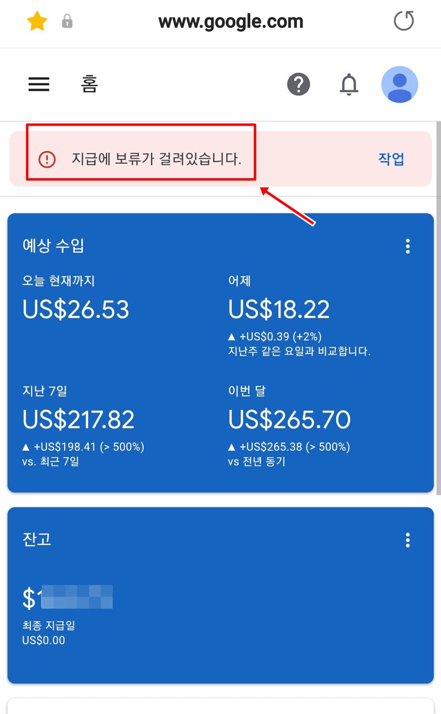 그러나 구글애스센스 홈에 가보면 아래 사진과 같이 지급보류가 걸려있습니다.