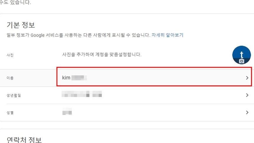 [기본정보]에서 이름 부분을 클릭해주세요.