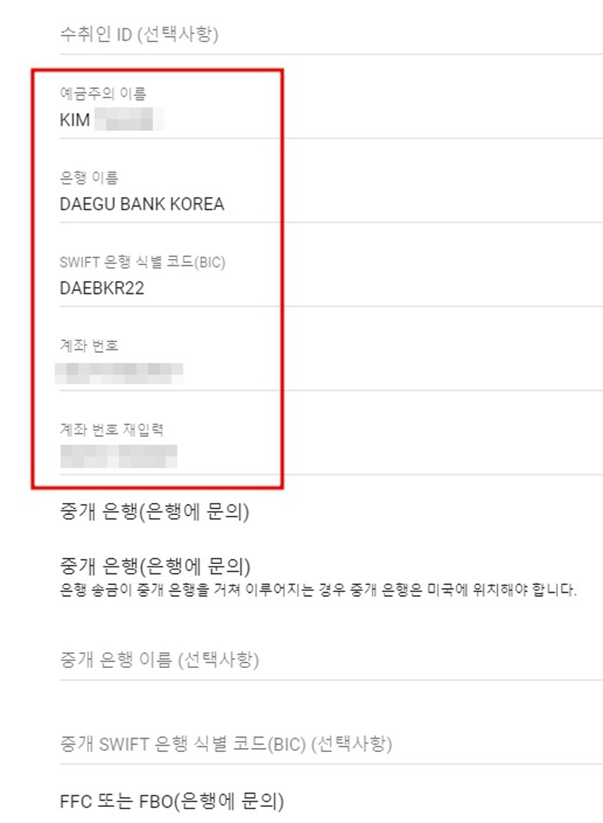 성과 이름을 아까 구글애드센스 외환계좌 등록 창에 있는 이름과 동일하게 “KIM MI NAM"이라고 바꿔주시면 됩니다.