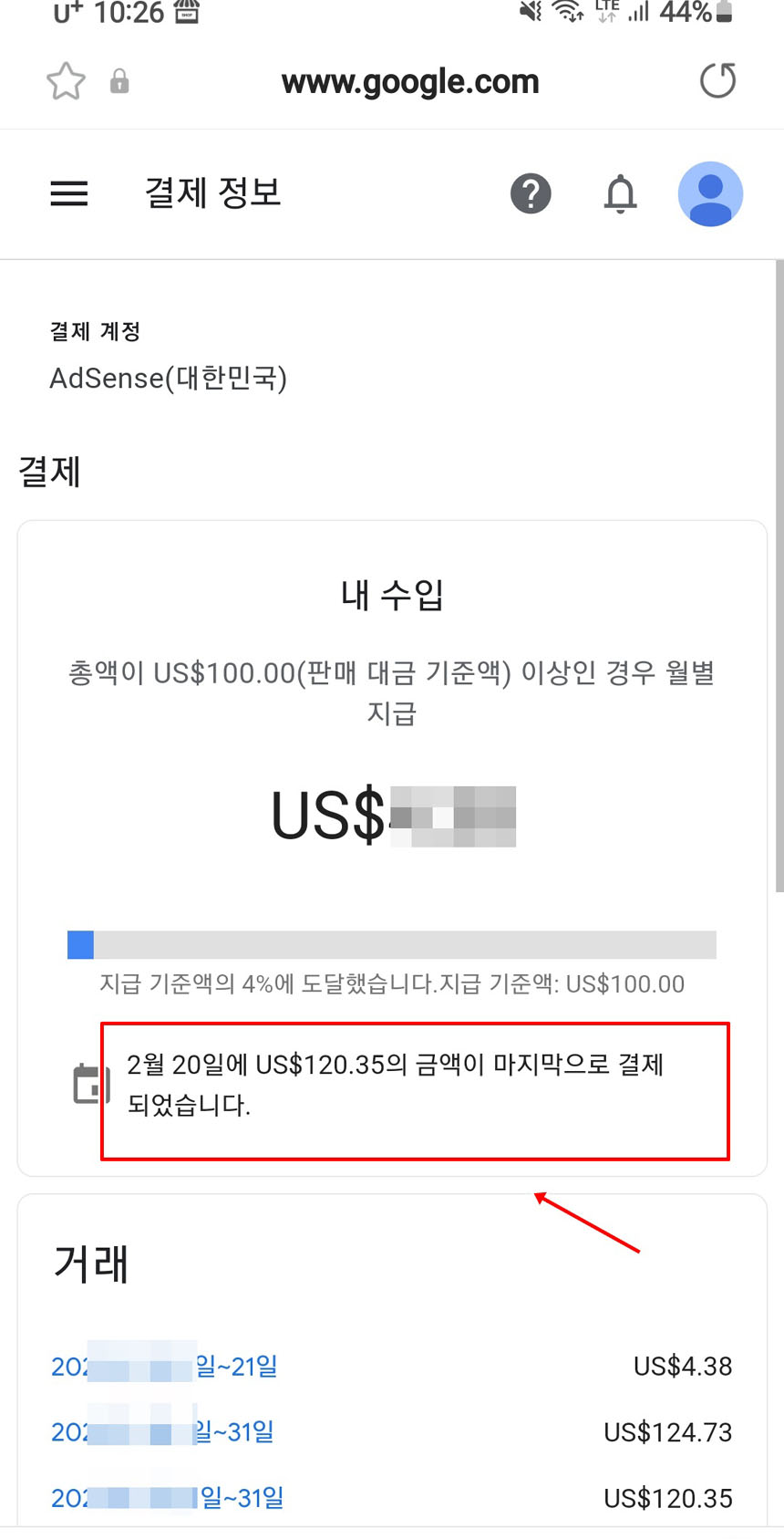 그리고 얼마 후 구글 애드센스페이지 정산페이지를 보니 120달러가 저의 외환계좌로 입금을 했다는 메시지가 보입니다.