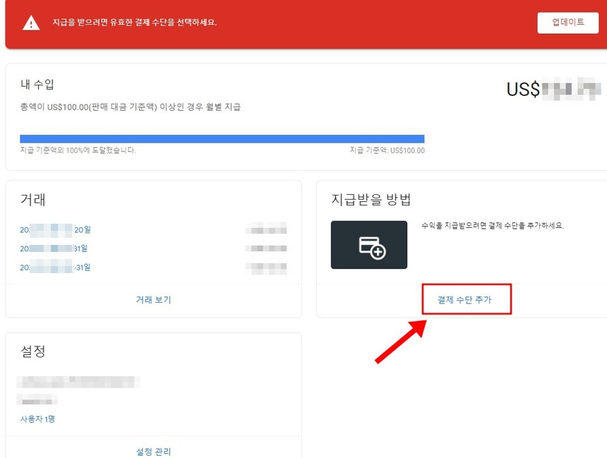 [지급받을 방법]에서 “결제 수단 추가”를 클릭해주세요.
