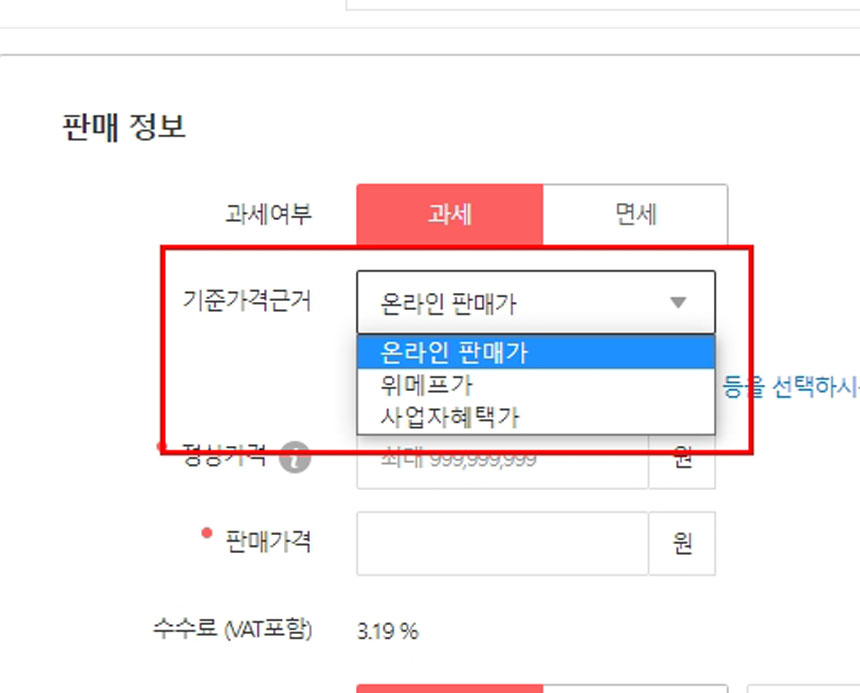 [판매정보]에서 기준가격근거가 3가지 유형으로 나타나는데,