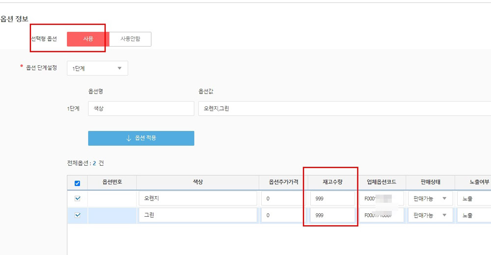 옵션이 있는 제품이라면 옵션등록을 해주세요.