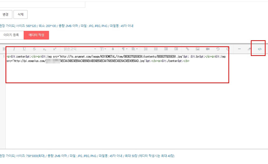 아래 사진과 같이 [에디터작성]을 클릭한 뒤 본문에 HTML코드를 복사해서 넣어주세요.