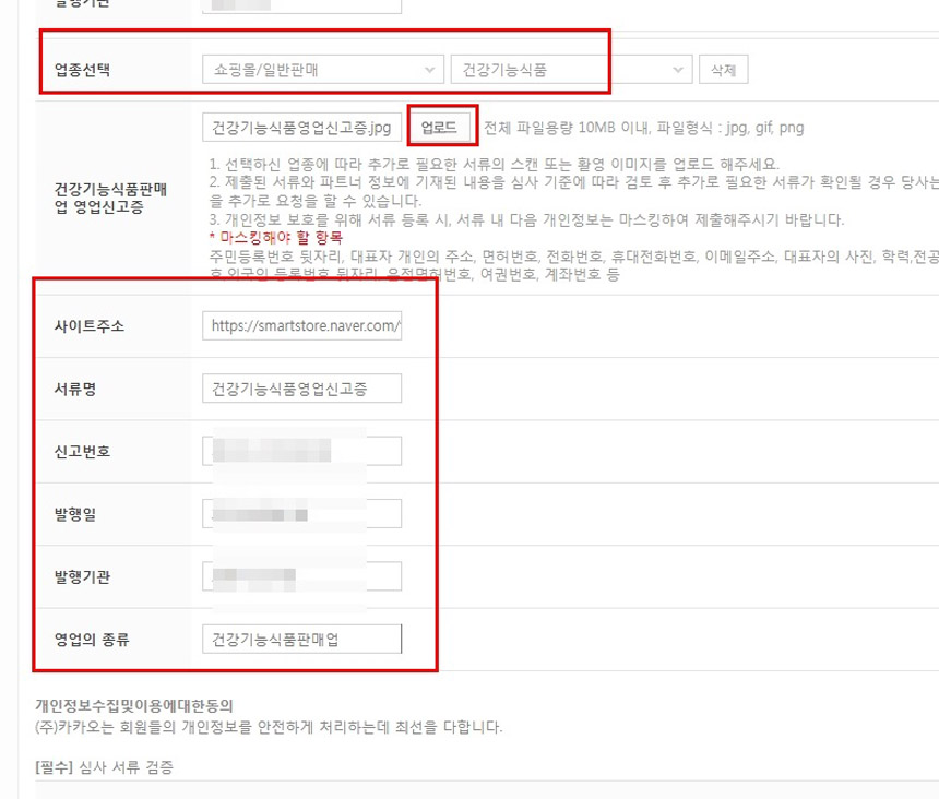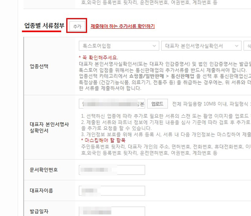모두 입력이 끝났으면 건강식품이나 의료용품 판매하실 분들은 상단의 “업종별 서류첨부”옆의 [추가]버튼을 또 한 번 클릭해주세요.