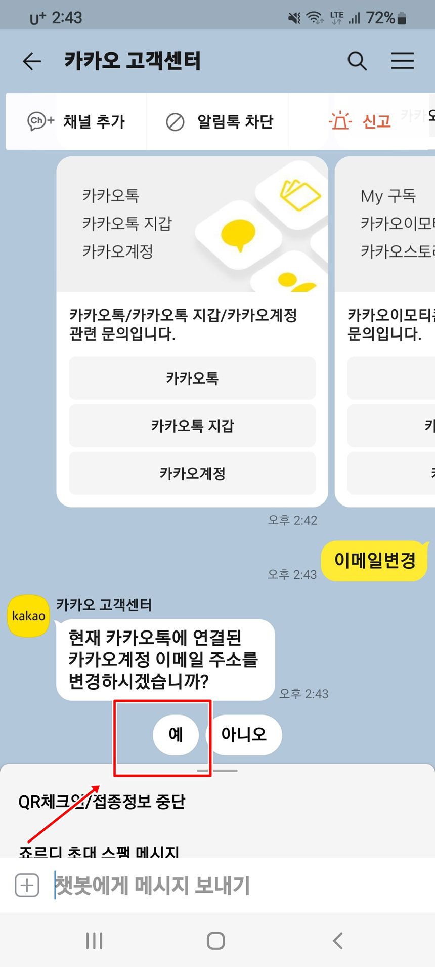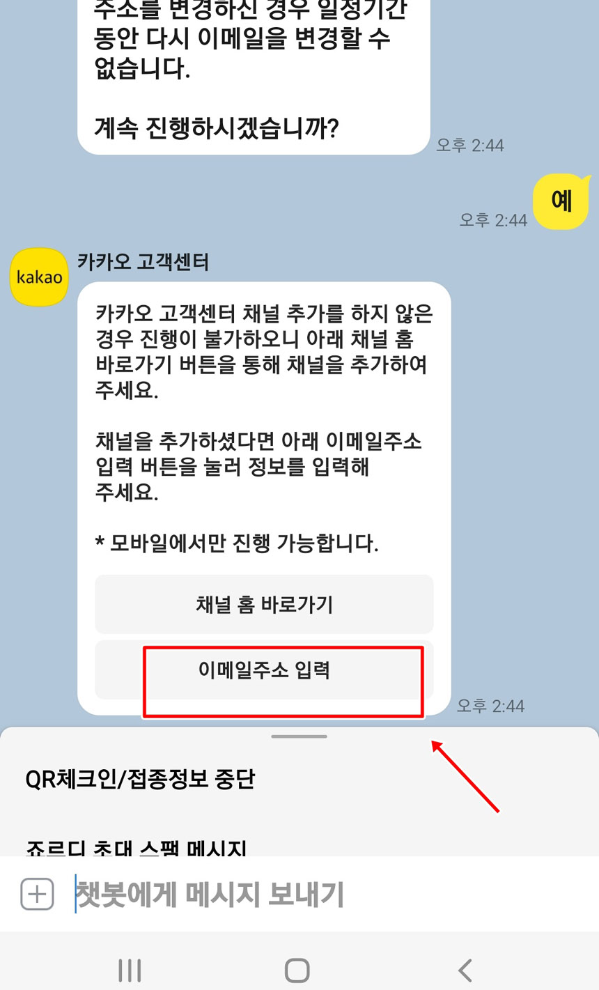 맨 아래에 “이메일변경”이라고 입력하고 비행기표시를 클릭해주세요