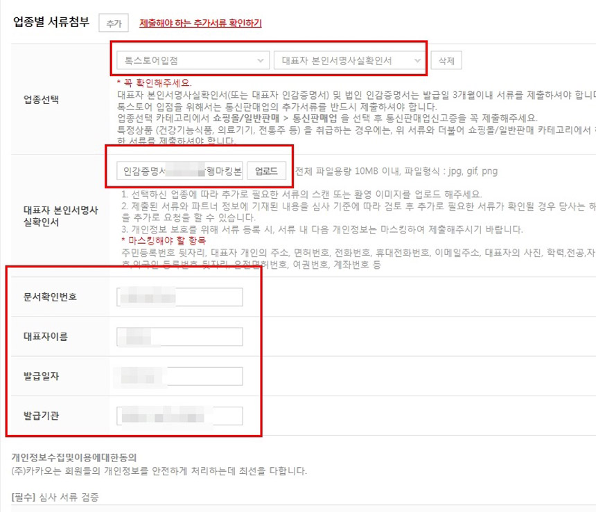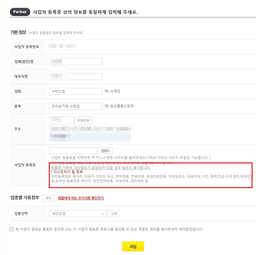 또 주의할 것은 주민번호 뒷자리, 대표자 개인의 주소, 면허번호, 전화번호, 휴대전화번호, 이메일주소, 대표자의 사진, 학력,전공,자격,경력,외국인번호,외국인 등록번호 뒷자리, 운전면허번호, 여권번호, 계좌번호 등은 안보이게 마스킹 한 후 업로드 해야 합니다.