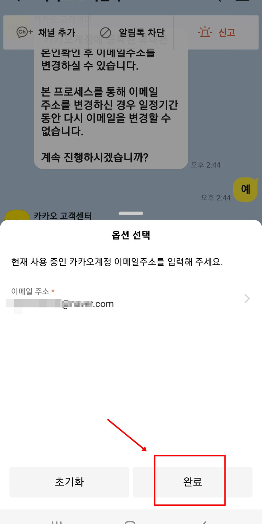 이메일 주소 변경 유무 질문에 “예”를 클릭해주세요.