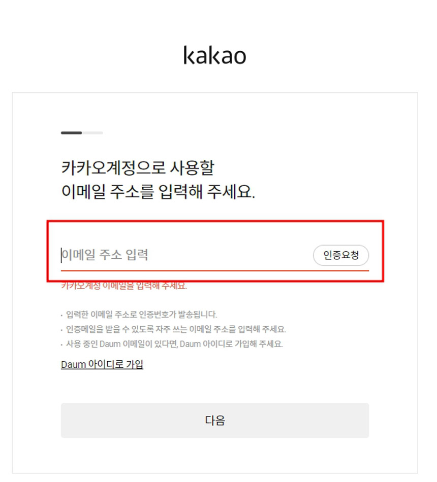카카오계정 이메일주소를 입력하고 “인증요청”을 클릭해주세요.