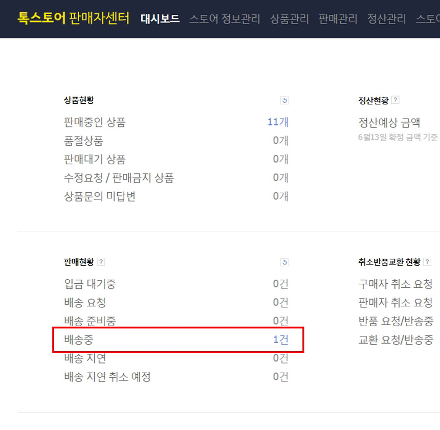 이제 초기화면으로 가보면 “배송준비중“에 1건이 떠 있습니다.