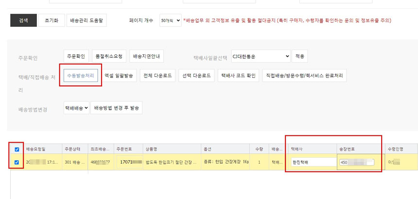 공급사에서 송장이 나오면 톡스토어에서 해당 주문건에 체크 후 송장번호를 입력하고 상단의 “수동발송처리”를 클릭하면 끝!
